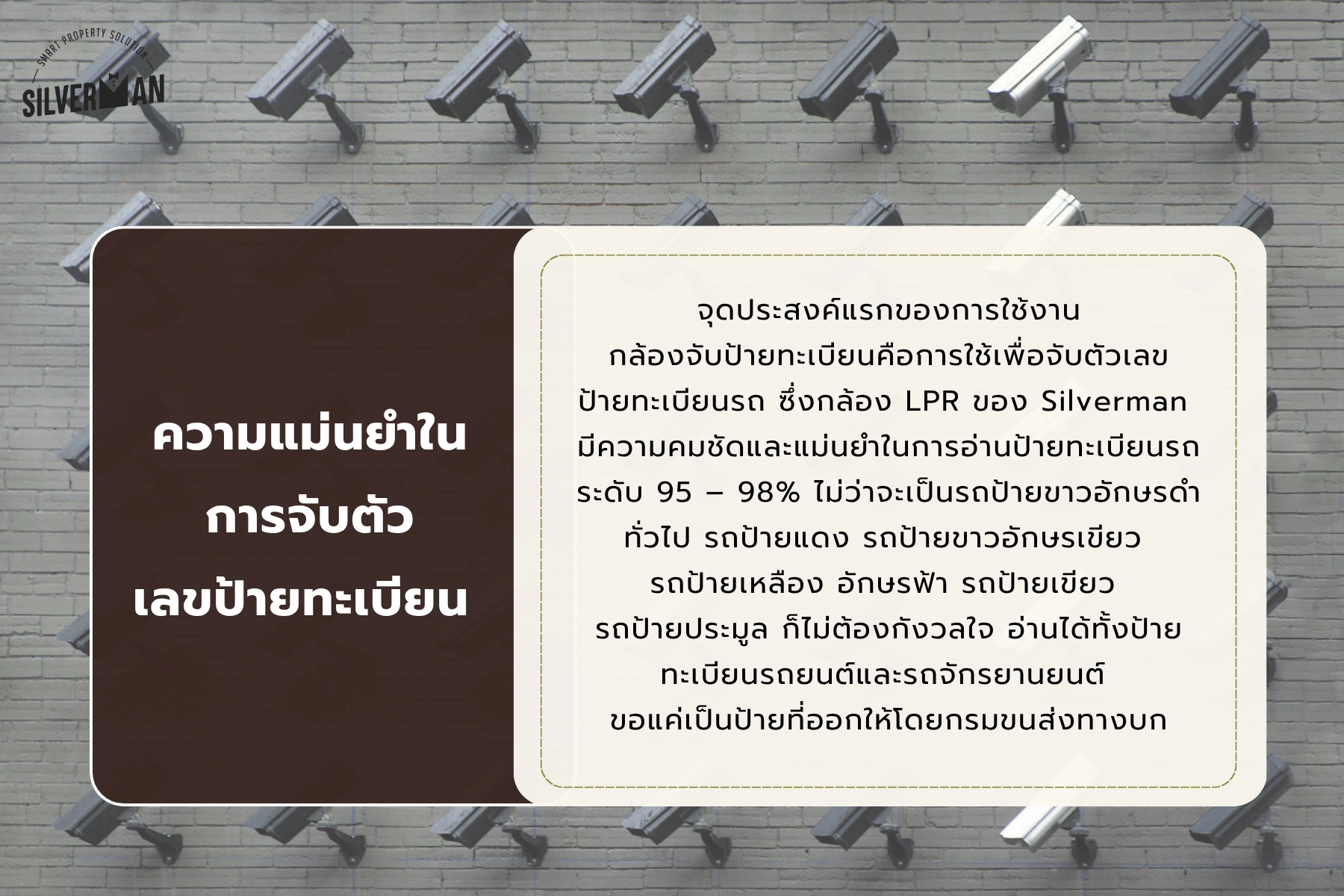 ขึ้นชื่อว่าเป็นกล้องจับป้ายทะเบียน จุดประสงค์แรกของการใช้งานย่อมหนีไม่พ้นการใช้เพื่อจับตัวเลขป้ายทะเบียนรถ ซึ่งกล้อง LPR ของ Silverman มีความคมชัดและแม่นยำในการอ่านป้ายทะเบียนรถระดับ 95 – 98% ไม่ว่าจะเป็นรถป้ายขาวอักษรดำทั่วไป รถป้ายแดง รถป้ายเหลือง รถป้ายขาวอักษรเขียว อักษรฟ้า รถป้ายเขียว รถป้ายประมูล ก็ไม่ต้องกังวลใจ อ่านได้ทั้งป้ายทะเบียนรถยนต์และรถจักรยานยนต์ ขอแค่เป็นป้ายที่ออกให้โดยกรมขนส่งทางบก