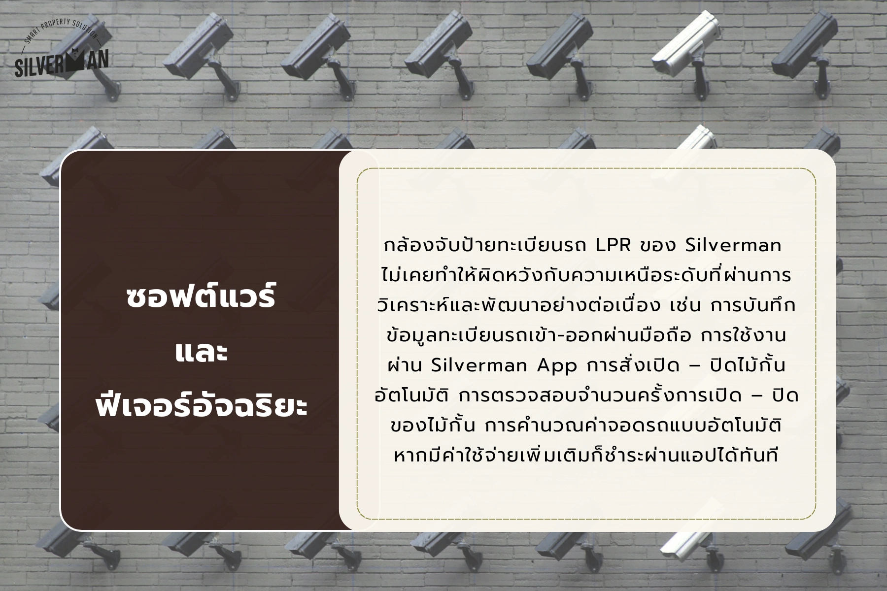 สำหรับใครที่สนใจในเรื่องซอฟต์แวร์ของซิลเวอร์แมน รวมถึงฟังก์ชัน ฟีเจอร์อัจฉริยะต่าง ๆ ยืนยันว่ากล้องจับป้ายทะเบียนรถ LPR ของ Silverman ไม่เคยทำให้ผิดหวังกับความเหนือระดับที่ผ่านการวิเคราะห์และพัฒนาอย่างต่อเนื่อง เช่น การใช้งานผ่าน Silverman App บันทึกข้อมูลทะเบียนรถเข้า-ออกผ่านมือถือ การสั่งเปิด – ปิดไม้กั้นอัตโนมัติ ตรวจสอบจำนวนครั้งการเปิด – ปิดของไม้กั้น การคำนวณค่าจอดรถแบบอัตโนมัติ กรณีมีค่าใช้จ่ายเพิ่มเติมยังสามารถชำระผ่านแอปได้ทันที สิ่งเหล่านี้ถือเป็นความพิเศษและความแตกต่างของกล้องอ่านป้ายทะเบียน LPR จาก Silverman